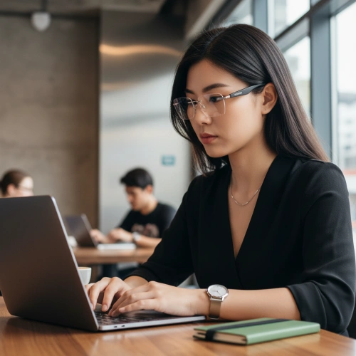 a girl wearing audio glasses using a laptop computer